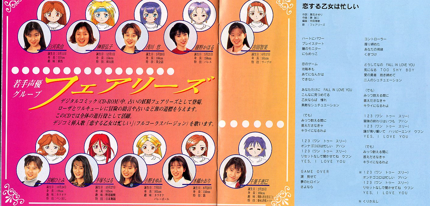 ・中学生日記出演。 ・写真集発売。 ・わかしゃち国体キャンペーンソング「わかしゃちNo.1」歌唱。 愛知県内の一部の図書館でカセットテープ貸し出し中。 ・名古屋市内の某女子高の卒業生を送る会と翌年の文化祭のゲストで 「わかしゃちNo.1」を披露。 ・ナムコのPCソフト「ワルキューレの伝説 外伝 ローザの冒険」に 若手声優ユニット「フェアリーズ」の一員として出演していた? ・ラジオ番組「ラジオはアメリカン」にフェアリーズとしてゲスト出演。 「私、わかしゃち国体っていうののテーマソング歌ってたんですよ。 近所に三河安城駅という大きな駅があって・・・」と発言? ・安城市福釜町では「わかしゃちNo.1」が今も盆踊りとして踊り継がれている。 引き続き情報を募集していきたい。 追記。フェアリーズの写真を見つけたが顔もプロフィールも全然違うな。 だんだん自分が怖くなってきた・・・。