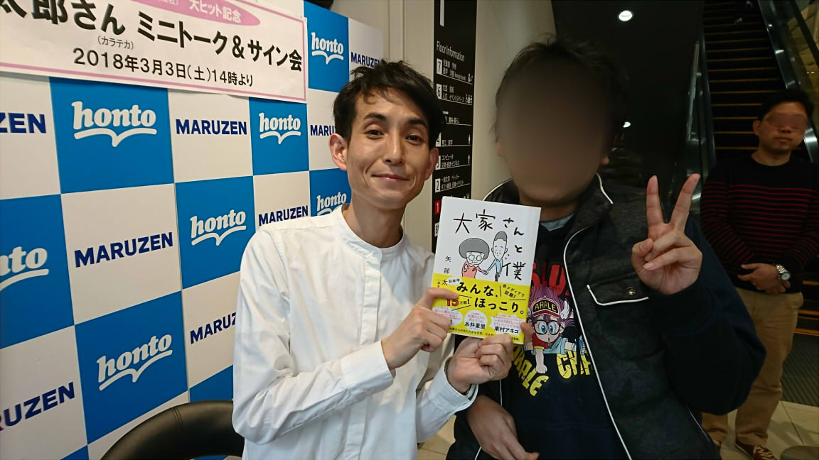 旧作連載当時はドラゴンボールとHUNTERXHUNTERに似てると言われていたが 今作の悪に屈して荒廃した世界という設定はキン肉マンⅡ世に近いと思う。 そういえば旧作でもバンカーサバイバルやピザの斜塔で明らかに死んだキャラが あっさり生き返ったりしてたのでバンカーの設定自体、人間が修行してなる物というより キン肉マンの超人に近いのかもしれない。 最近のアニキは高橋名人コーナーくらいしか見る物が無かったので今後も楽しみだ。 そして旧作の単行本やファンブックも揃えている者としては新装版コミックも買いたい所だが 紙版を買うか電子版を買うかで非常に悩んでいる。 物としての価値もあるし帯も付いてるしで紙版も良いんだけど、収納場所の問題もあるし ウチは虫害が酷いという特殊な事情もある。恐らくすぐにしまっちゃって読まないだろう。 一方、電子版は汚れないし、いつでも気軽に読める。 特に電車内で周りがスマホ画面を見てる中、タブレットをドヤって見れるのもポイントだ。 奇しくもドラゴンボールとHUNTERは電子版で揃え始めてるので、やはり電子版かなぁ。 追記。て事で電子版を買ったのだが表紙と一枚絵になってる裏表紙が収録されてないのが 不満である。小学館はこういう方針らしい。先に知っときゃ良かった。 PR 丸善名古屋本店にて行われた人気コミックエッセイ「大家さんと僕」の作者 矢部太郎先生のサイン会に行ってきた。 こういう大きな本屋は久々に来たので、かなりワクワクした! コミックコーナーなんて無くても十分、楽しめるなー。 電波少年的放送局を毎日観てましたと言ったら、そんな人に初めてあったかも? とかなり驚かれた。分かってはいたけど、そんなに視聴者少なかったのか・・・! T部長に、こんな放送観てるヤツなんか居ないと言われていたとか この間も糸井さんが、あの番組は早すぎたと仰っていたとか色々教えて貰えた。 ガッツリ読み込もうと思って文具コーナーでブックカバーと ついでにキャンペーンで出川哲郎REALGACHI消しゴム付きのシャーペンを購入。 てか、よく考えたら矢部太郎と出川哲郎が大人気って今、凄い時代だ!